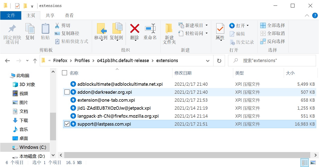 C:\Users\你的用户名\AppData\Roaming\Mozilla\Firefox\Profiles\o41pb3hc.default-release\extensions